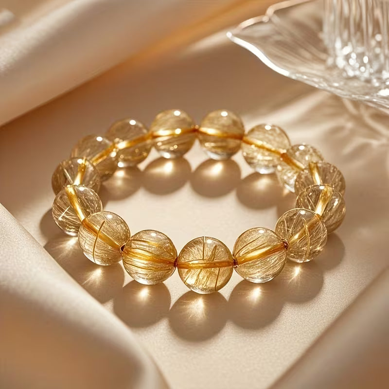 Crafted from natural golden hair crystal, this bracelet features delicate, hair-like inclusions that shimmer subtly within each bead. The unique internal patterns create a refined, luminous effect, making every bracelet one of a kind.